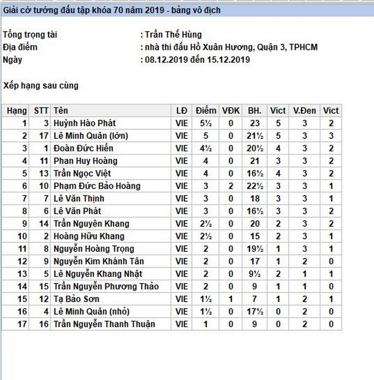 Kết quả sau cùng, Huỳnh Hào Phát đã xuất sắc giành chức vô địch chung cuộc khi thắng nhẹ nhàng ván cuối trước đàn em Phan Huy Hoàng. Đây cũng là chiếc cúp danh giá đầu tiên mà trong gần 2 năm qua tài năng trẻ này giành được khi liên tiếp đứng thứ nhì trong hàng loạt giải đấu khác.