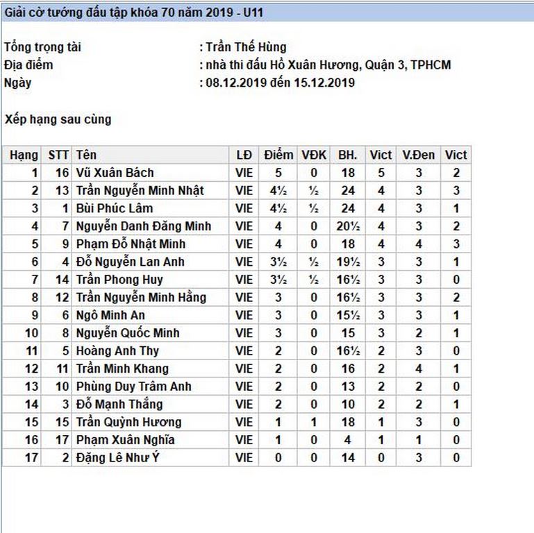 Kết quả chung cuộc bảng U11: