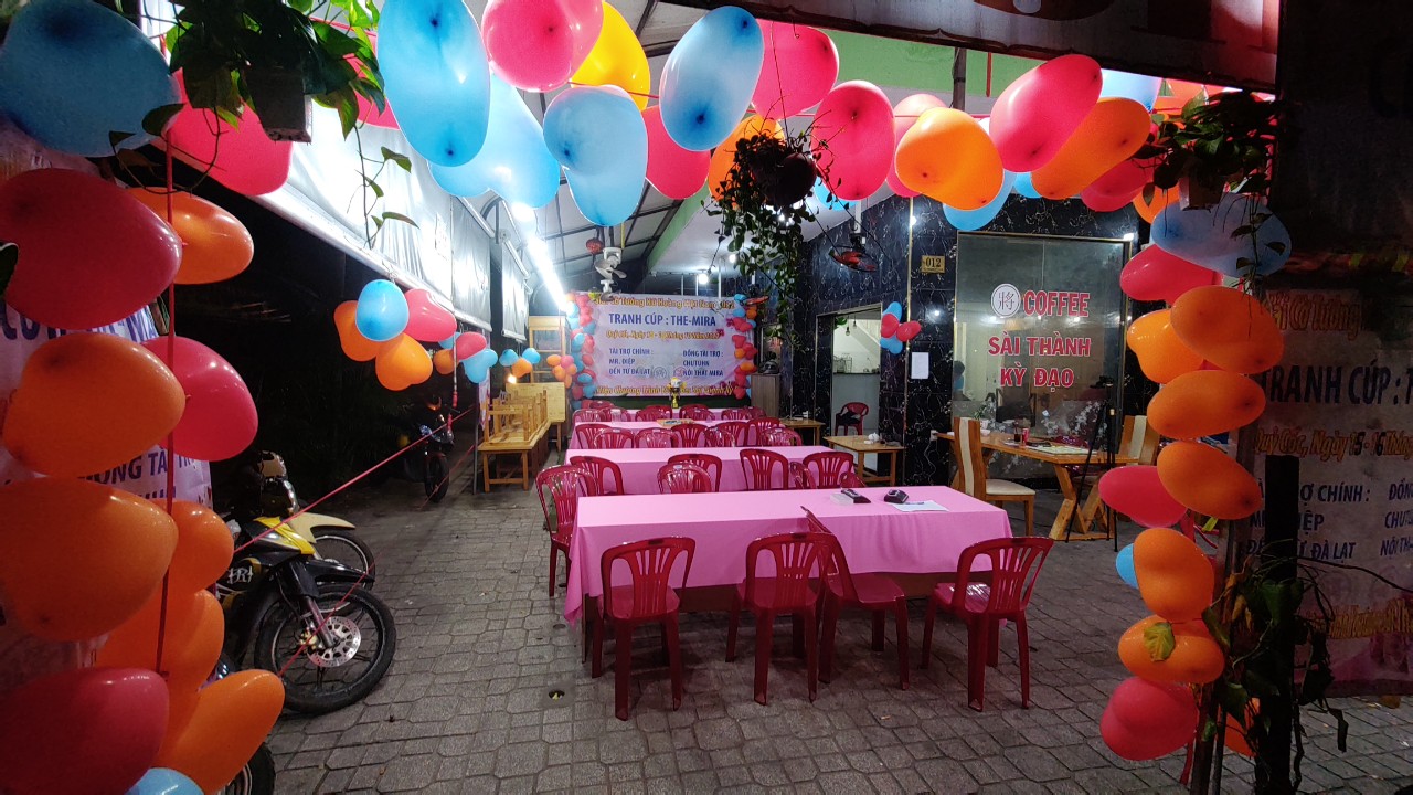 Toàn cảnh phòng thi đấu được trang trí bong bóng rất tươi rất đẹp.