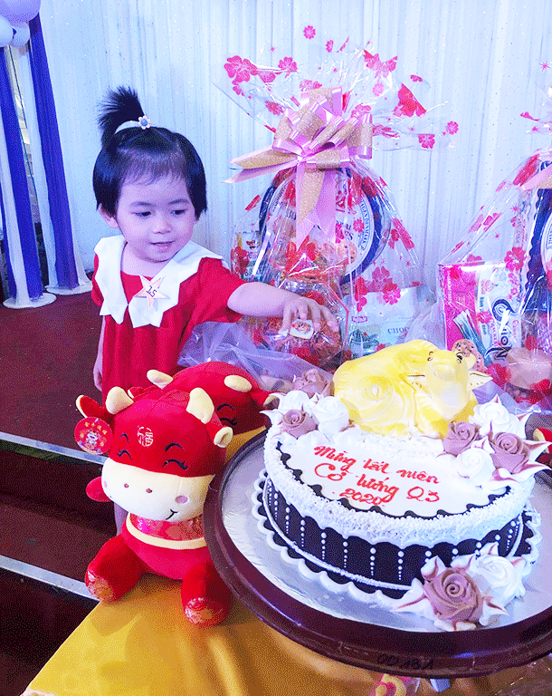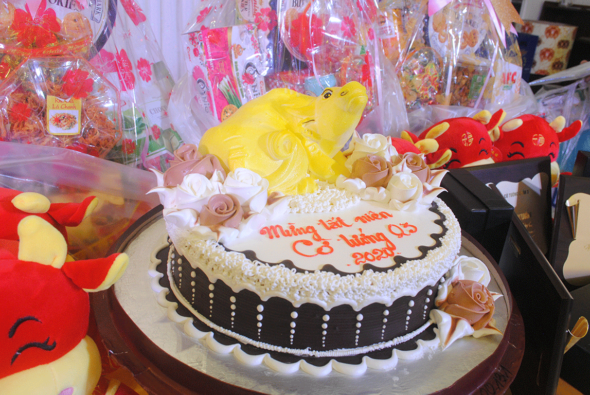 Chị Hương đã chuẩn bị một chiếc bánh kem hình trâu vàng thật đẹp...