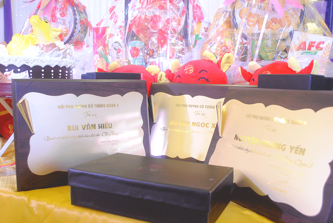 Những món quà thay cho lời cảm ơn tới 2 đối tác quan trọng của cờ tướng Quận 3. Công ty tư vấn - thiết kế - xây dựng Thiện Trúc và trường mầm non Kirin.