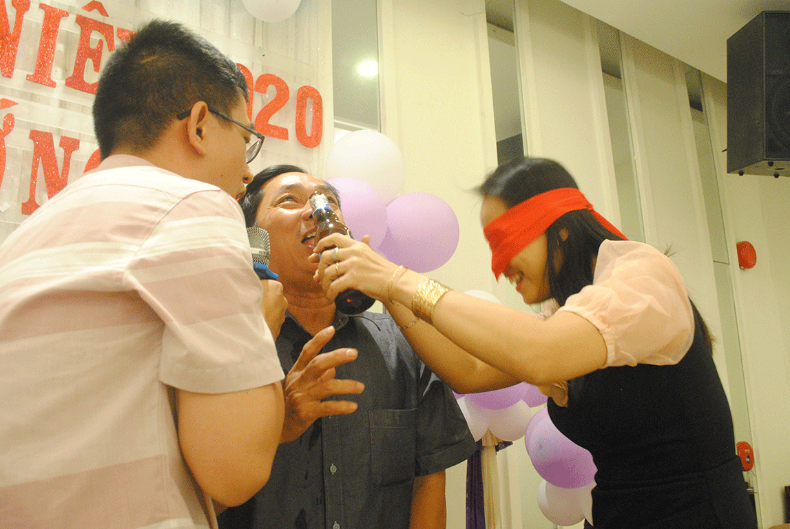 Trò cuối cùng là trò bịt mắt rót bia. Các cặp đấu khá xung.