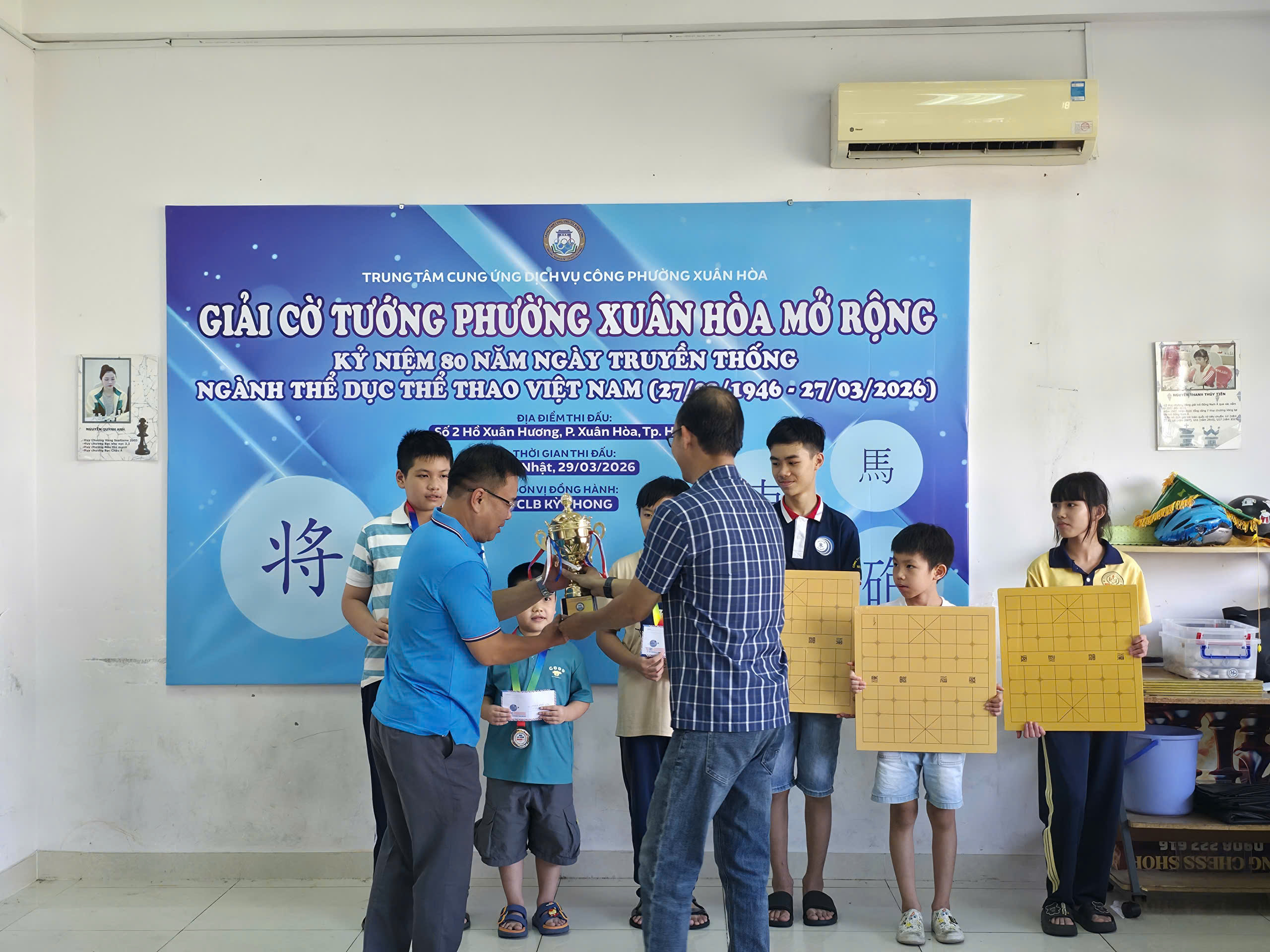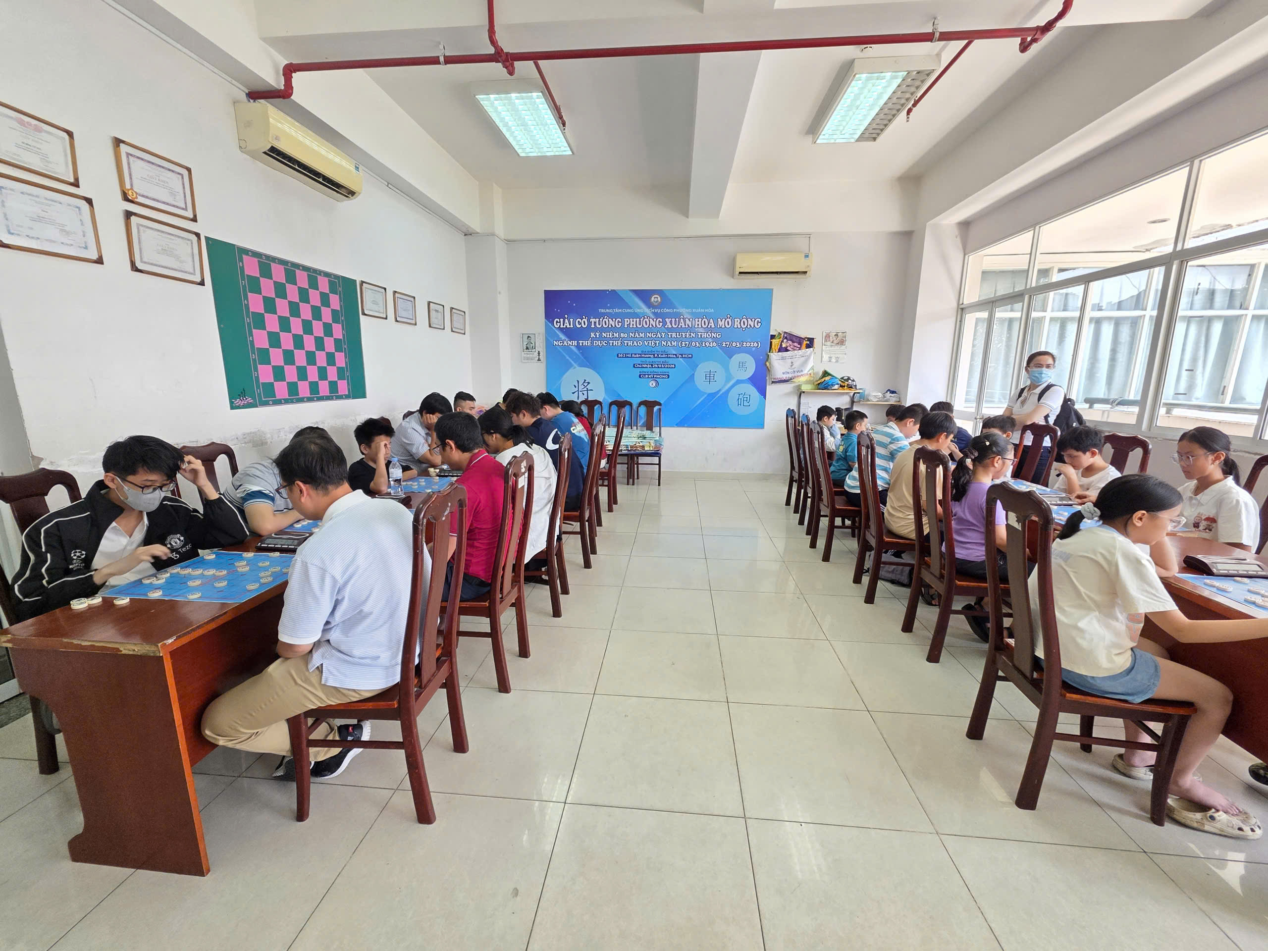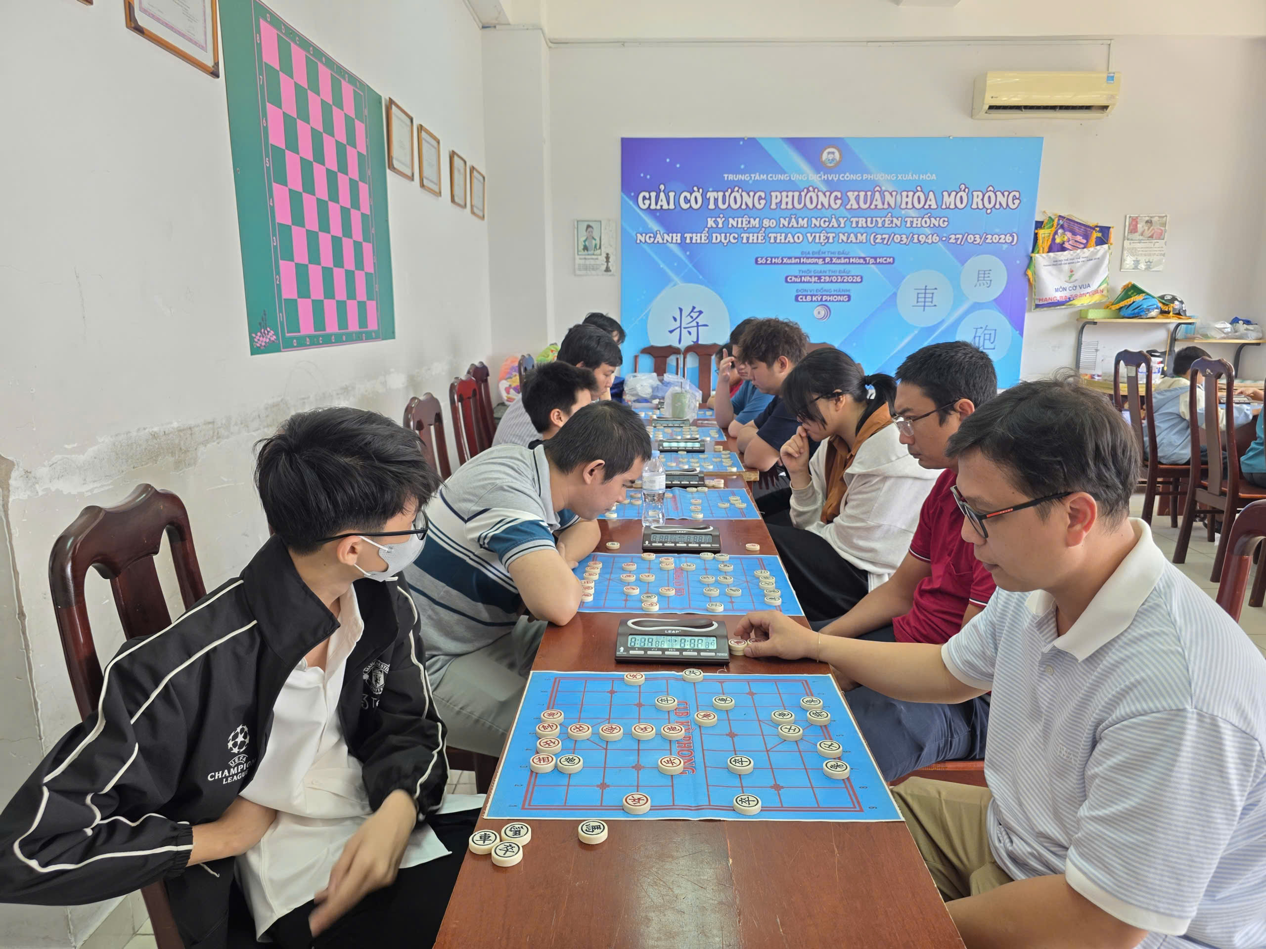 Giải đấu chào mừng 80 năm ngày truyền thống ngành thể thao Việt Nam đã diễn ra tại lầu 3 CLB Hồ Xuân Hương với sự tham dự của gần 40 kỳ thủ ở mọi lứa tuổi. Thi đấu cờ nhanh theo thể thức hệ Thuỵ Sĩ 5 vòng và trận chung kết ở mỗi bảng đấu.