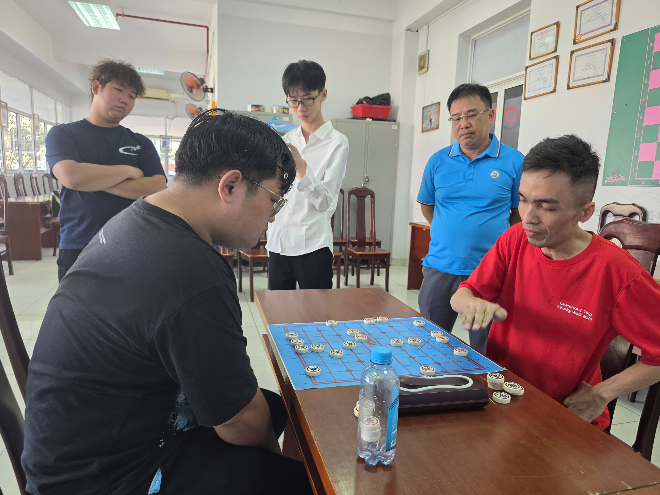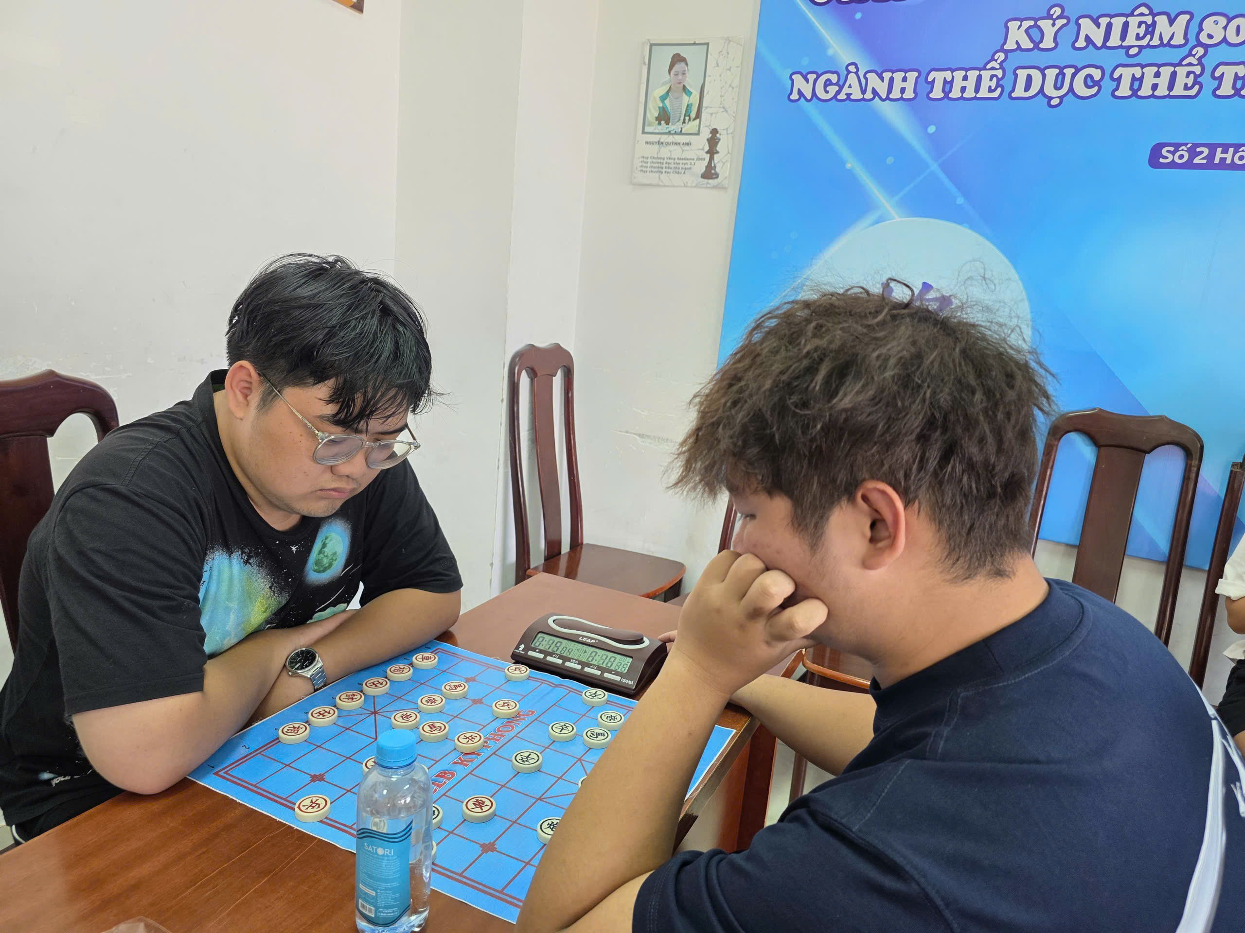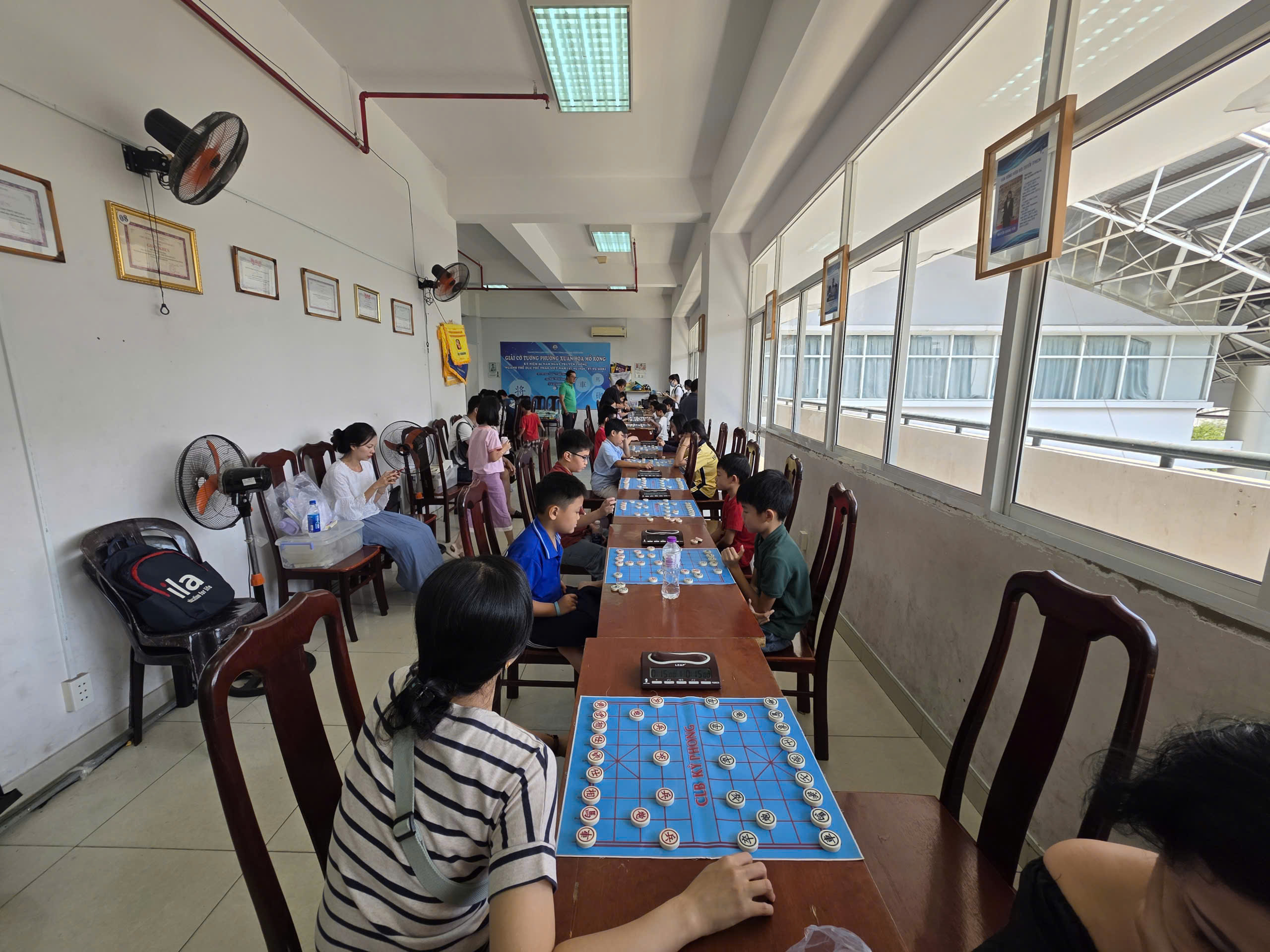 Toàn cảnh phòng thi đấu nhìn từ phía dưỡi. HLV Cao Phương Thanh đang chăm chú theo dõi học trò thi đấu.