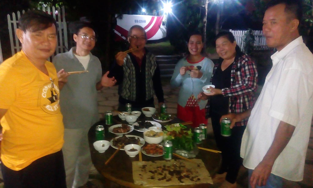 Làn nước trong xanh của hồ Tuyền Lâm tuy có làm con người ta dịu mát nhưng khi đói quá rồi thì tất cả phải ở lại phía sau. Đoàn trở về quán nem nướng Bà Hùng dùng bữa trưa trước khi tiếp tục hành trình thẳng tiến Mê Linh Coffee.