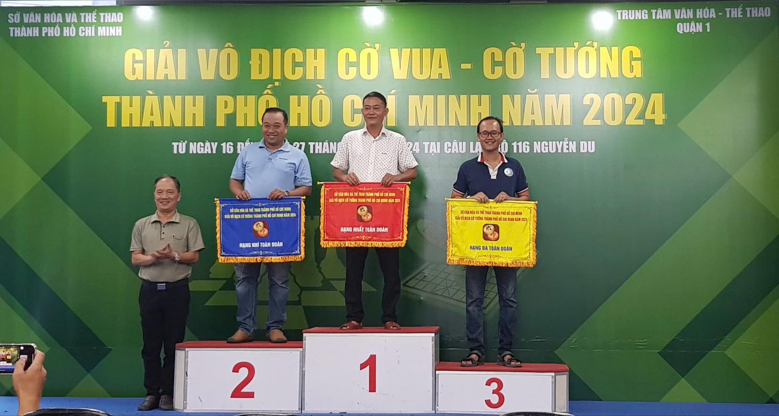 Thầy Bùi Văn Hiếu - Trưởng bộ môn cờ tướng Quận 3 nhận cờ hạng 3 toàn đoàn